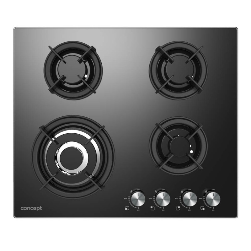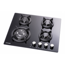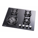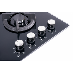 Design: speciální černé tvrzené sklo Ovládání: 4 knoflíky 4 plynové hořáky: ANO Trojitý WOK hořák: ANO Mřížky: 4x litinová mřížka Ovládací panel vpředu: ANO Pojistka proti úniku plynu: ANO Elektronické zapalování hořáků v knoflíku: ANO